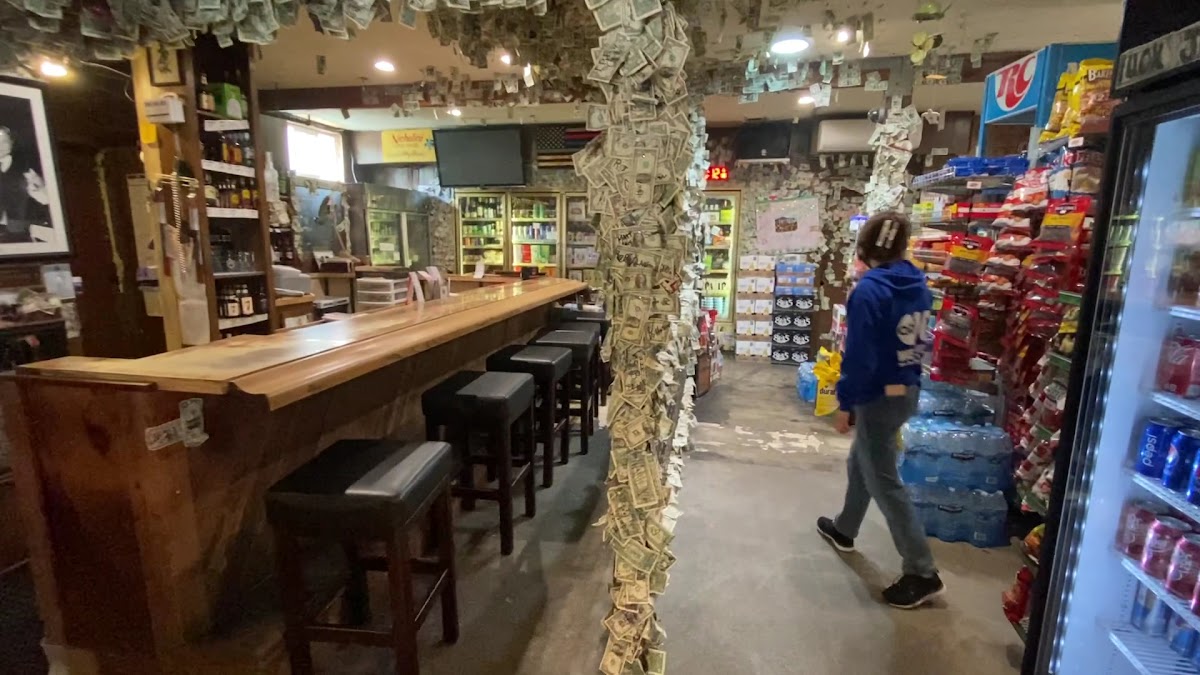 The atmosphere is unpretentious and welcoming, wrapped in a patchwork of well-worn memories evidenced by dollar bills pinned overhead—each one carrying a name or message from someone who stopped by long ago. Step inside and you’ll find yourself among a mix of neighbors, road trippers, and weekend visitors, all drawn by the easy comfort of a neighborhood bar and café that doubles as a convenient pit stop.